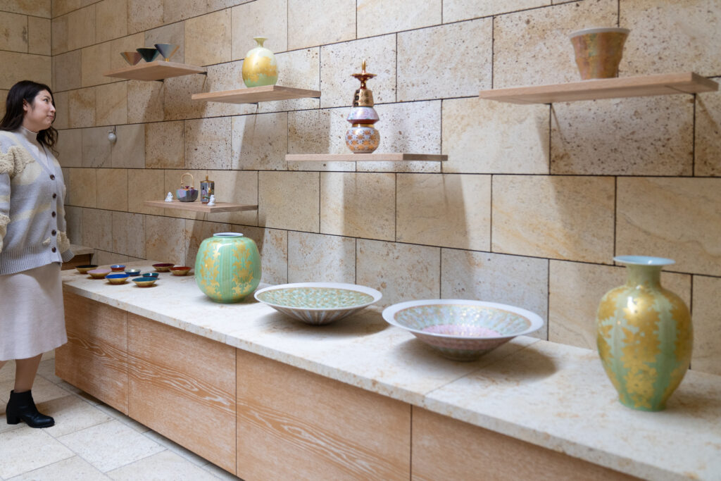 煌々とした照明ではなく、自然光の陰影の中でこそ際立つ九谷焼本来の美しさ。静かに差し込む光が、繊細な金彩や絵付けの奥行きを際立たせ、器に息吹を与えているように感じられます。