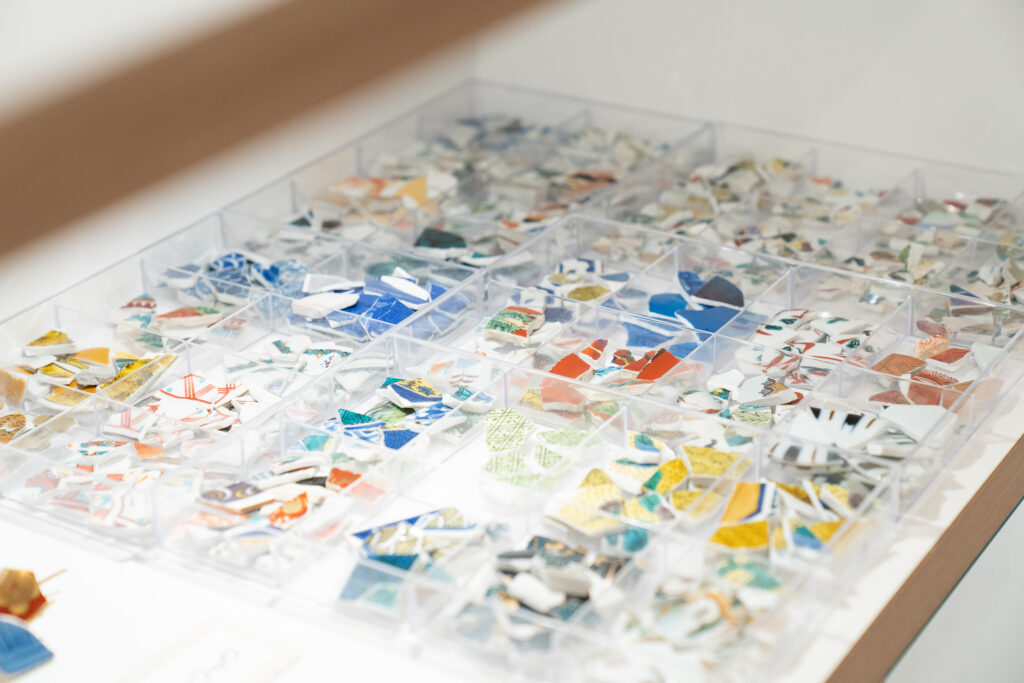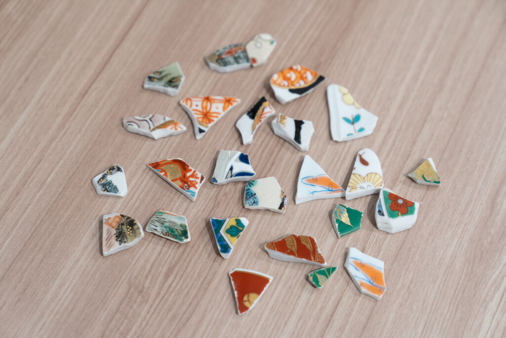 まずは、数えきれないほどの陶片の中から”自分だけのかけら”探し。大小さまざまな破片が並べられ、九谷焼ならではの鮮やかな色彩が目を引きます。