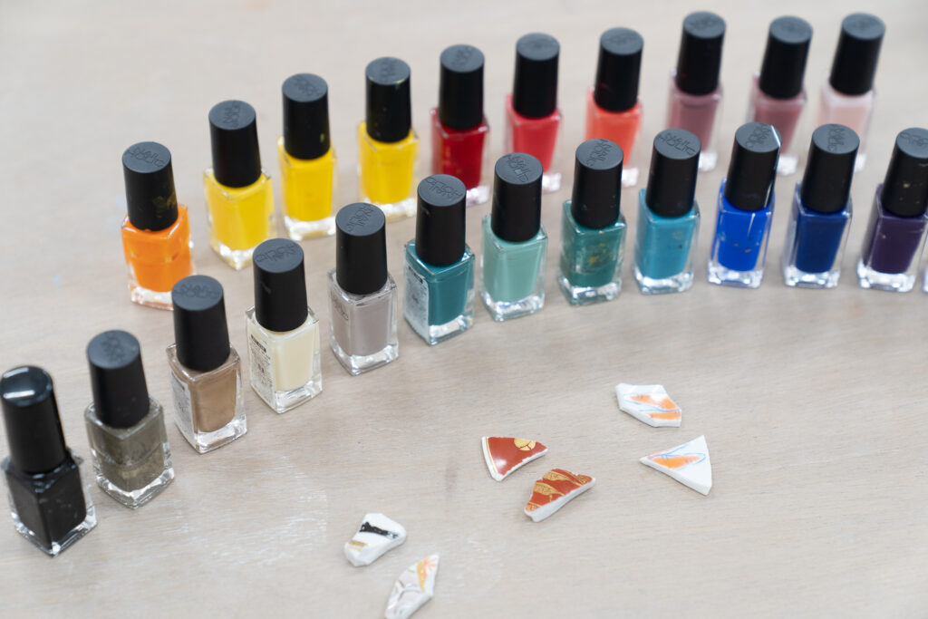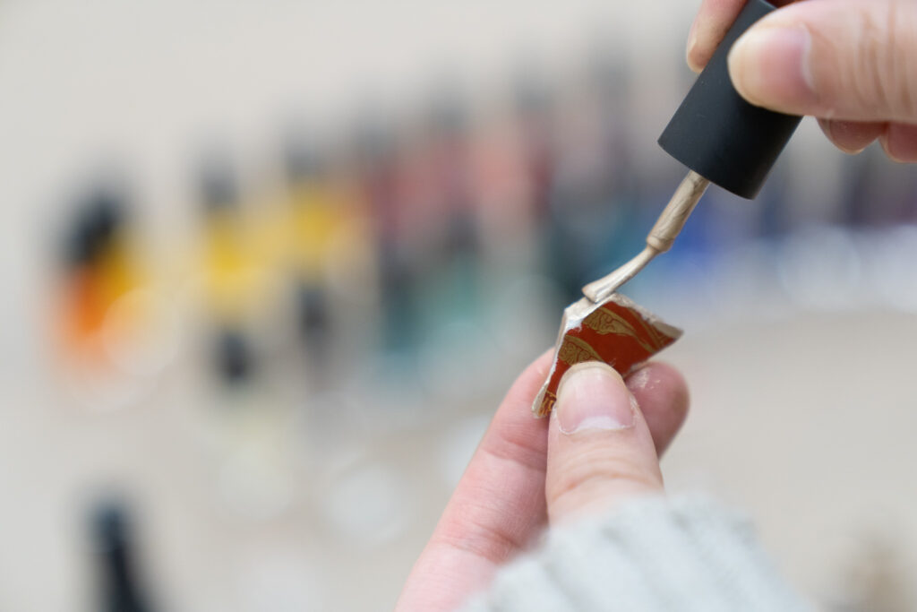 選んだら、陶片にマニキュアで色を塗っていきます。九谷焼本来の華やかさを生かしながら、自分だけの色を重ねていく時間は、まるで小さなアートを生み出すような楽しさ。