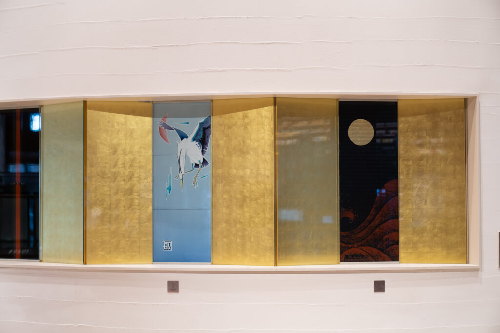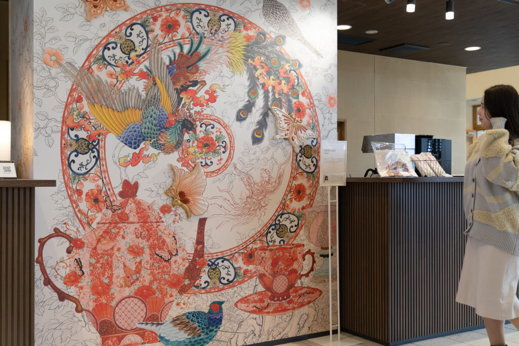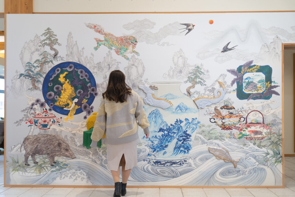 エントランスに足を踏み入れると、まず目に飛び込んでくるのは、九谷焼作家・牟田陽日(むた ようか)氏が手がけた壮麗な壁画。花鳥や獣、山水、器……九谷焼の世界が色鮮やかに描かれ、まるで物語の一場面に入り込んだかのような感覚に包まれます。