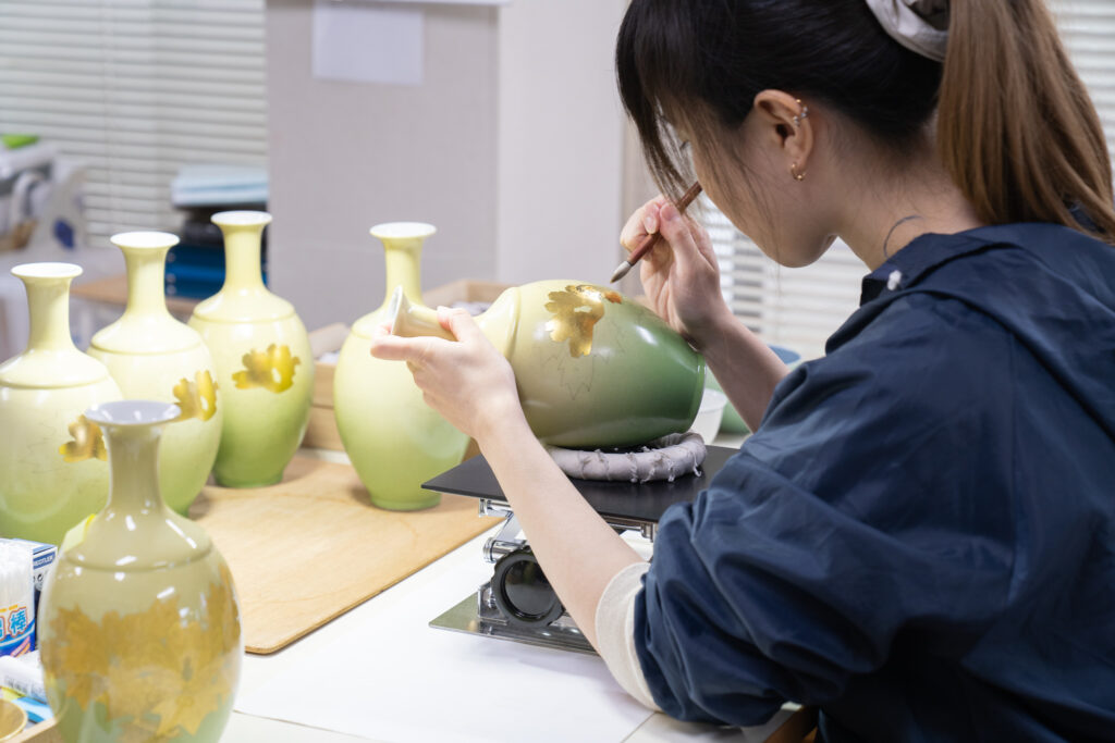 1906(明治39)年創業の錦山窯は、100年以上にわたり九谷焼の上絵付を専門とする窯元。なかでも、錦山窯が得意とするのは、金彩の技法です。
