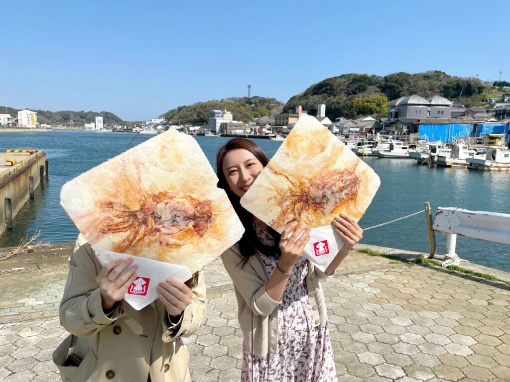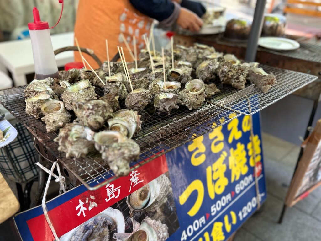 朝市ではサザエのつぼ焼き、「呼子プレス商会」では大きないかプレスせんべいが食べられるので、おやつにどうぞ。