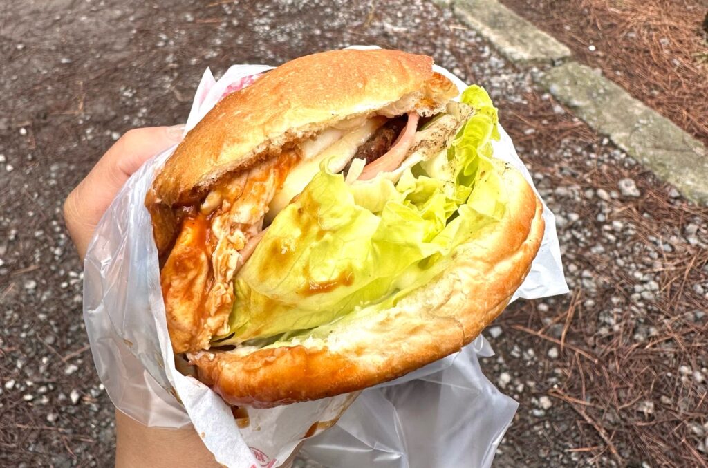外はパリッと、中はふわふわのパンに包まれて、パティ・たまご・ハム・チーズが入っています。