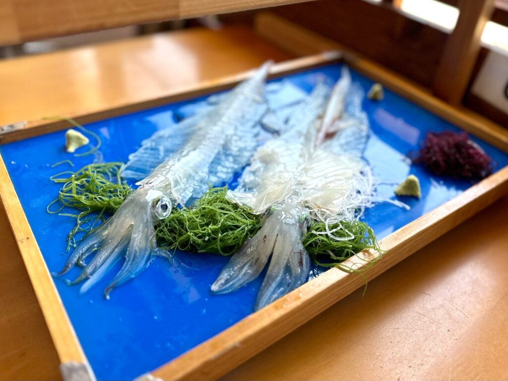 鮮度が高くまだピクピクと動く透明なイカ。他では食べられないような美味しさに大満足でした。