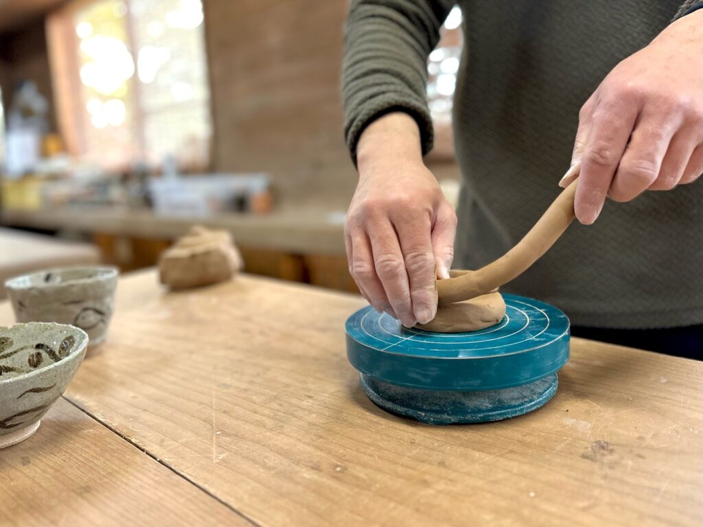 電動ロクロは使わずに、紐状の陶土を卓上ロクロの上に積み上げるようにして成形します。