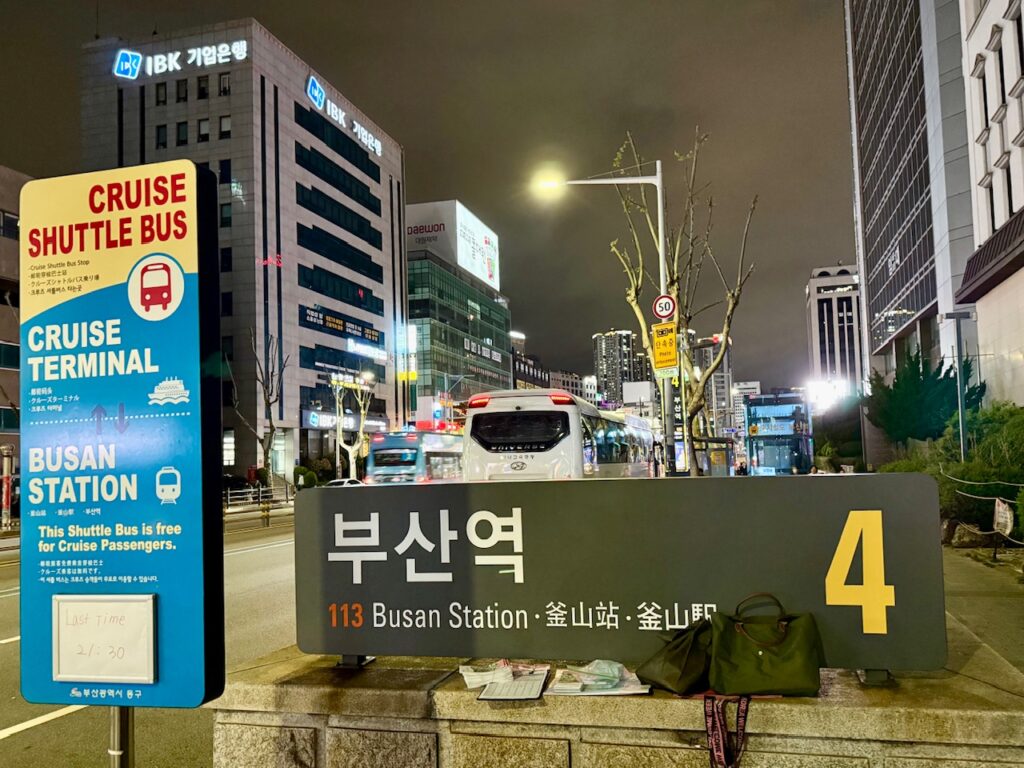 帰りは釜山駅4番出口付近から釜山港行きのシャトルバスが出ています。行きのシャトルバスで、帰りタクシーで船に戻るために、釜山港の住所が書かれているカードをもらいました。