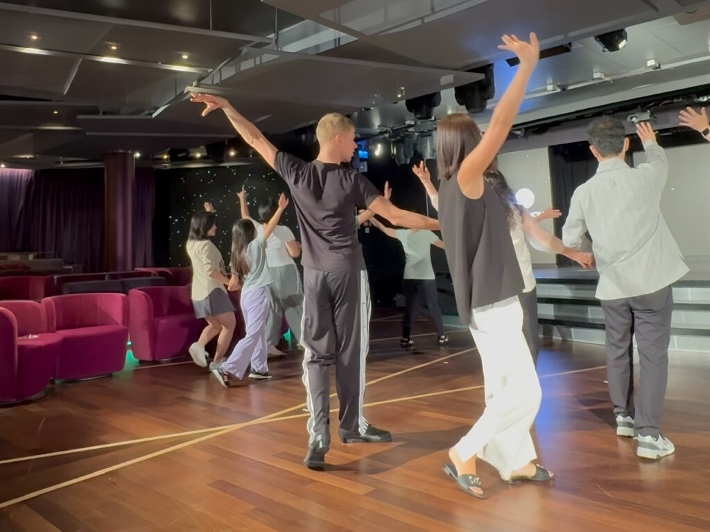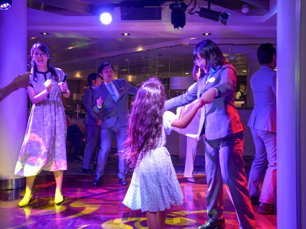 MITSUI OCEAN FUJIハウスハンド&ヴォーカリスト・クリスティ with クルーズスタッフとのダンスパーティーでは、スタッフさんが上手にリードしてくださり、娘もダンスを楽しんでいました。