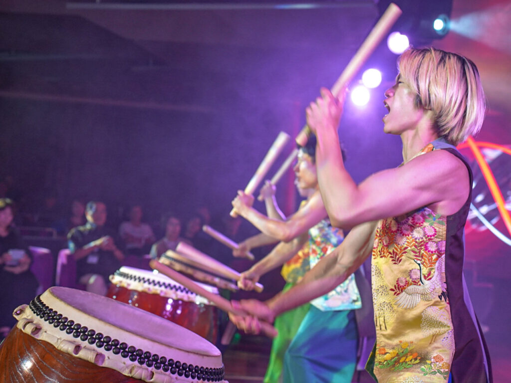 和太鼓グループ彩-sai-による大迫力のステージ。力強い和太鼓パフォーマンスにアンコールが出るほど大盛況!