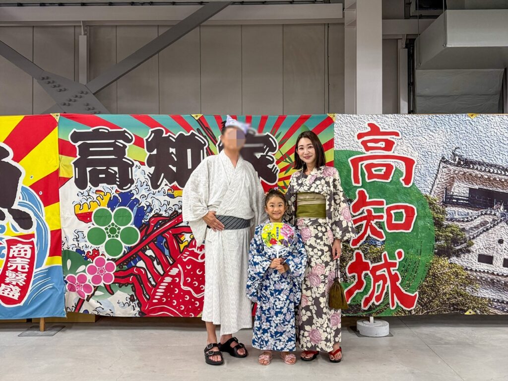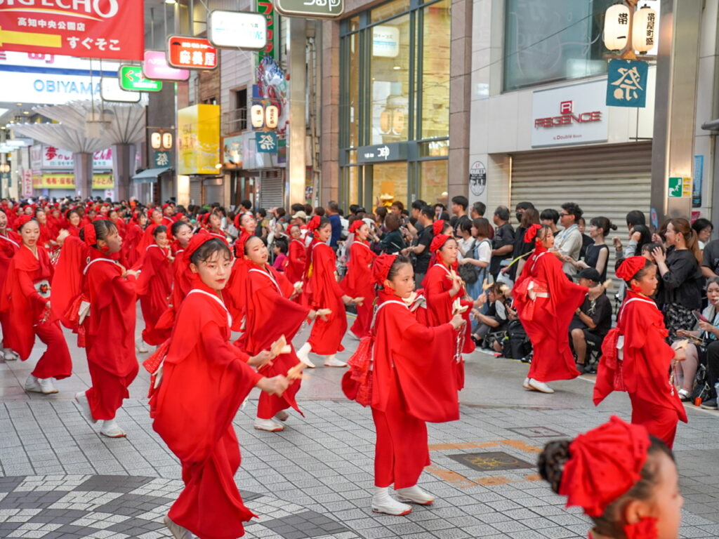 シャトルバスに乗ってよさこい祭りの会場近くまで移動。よさこい祭りは200チーム以上、約2万人が踊りに参加。観客数は100万人近いと推定され周辺は大混雑!