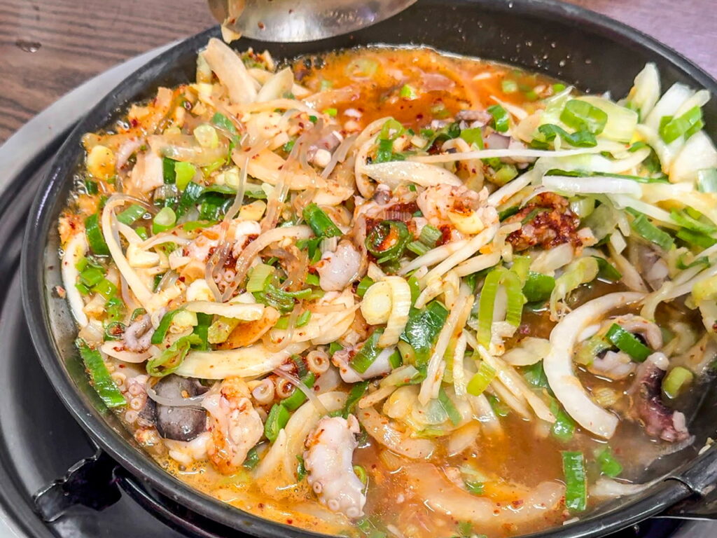 タコ・ホルモン・エビの旨みをピリ辛のヤンニョムと一緒に炒めるこの一品は、釜山で絶対食べて欲しい韓国料理のひとつ。