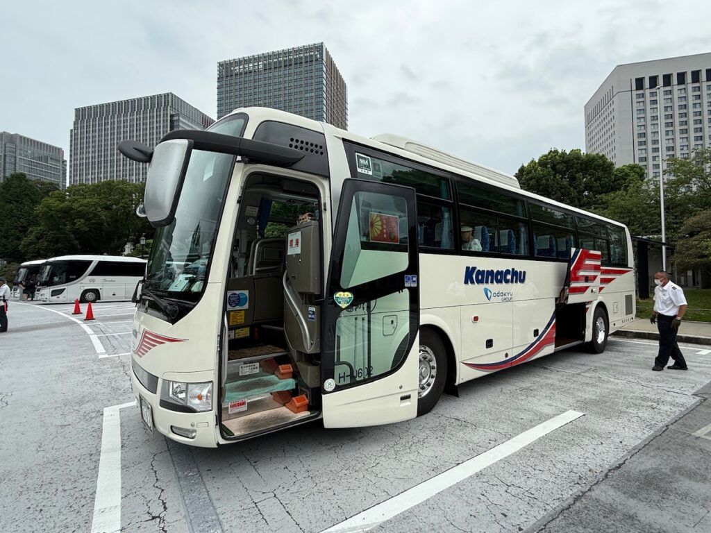 今回は皇居外苑楠公駐車場より晴海客船ターミナルまで船社が用意した無料シャトルバスを利用しました。30分に1本程度、駐車場から晴海旅客ターミナルまでピストン運行しています。