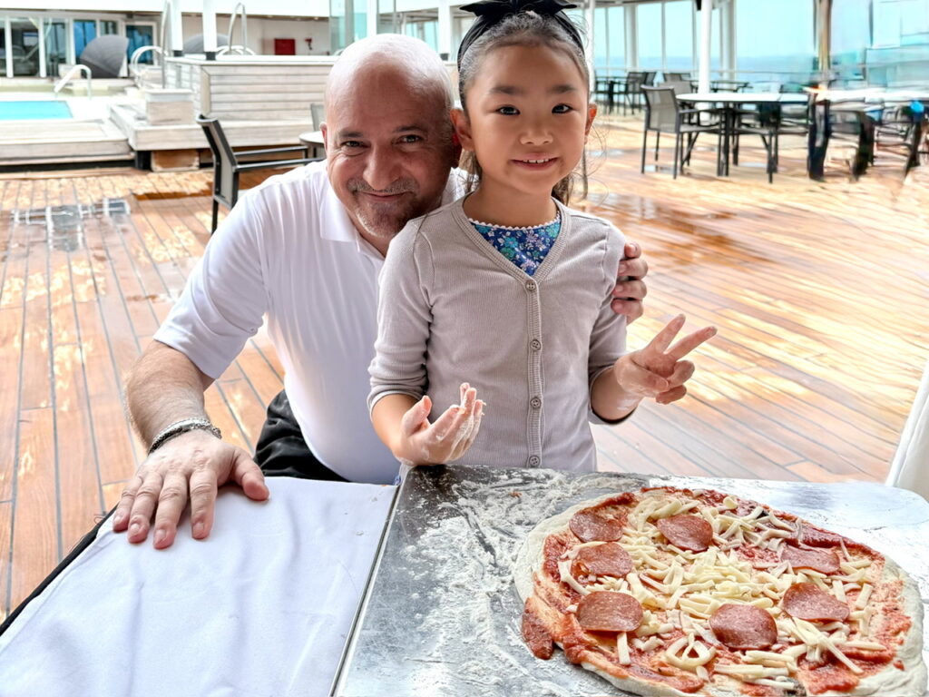 今日一番娘が楽しみにしていたピザ作り体験のイベント!以前、他のカジュアル船で有料のピザ作り体験に参加したことがありますが、三井オーシャンフジは無料で参加できました。