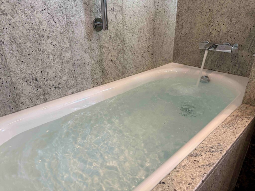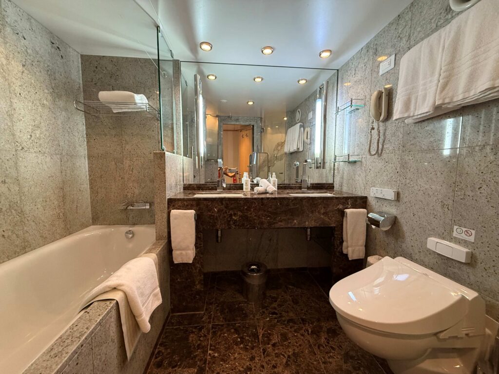 バスルームは大理石調で高級感たっぷり。トイレも日本式のウォシュレット付き、洗面台が2つあるので支度もスムーズにできます。