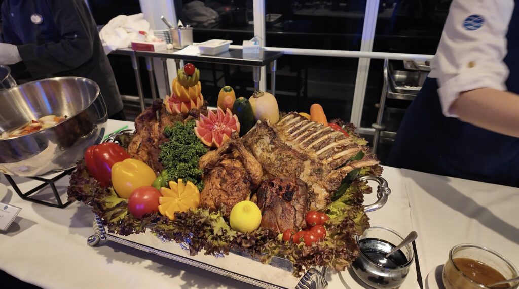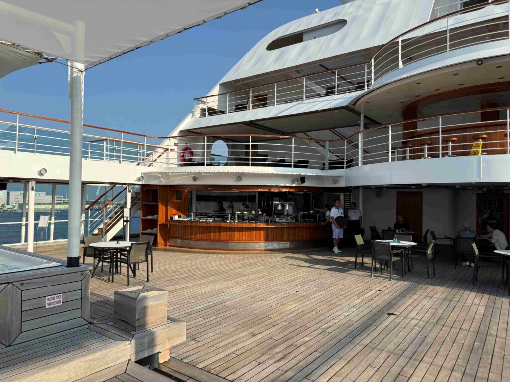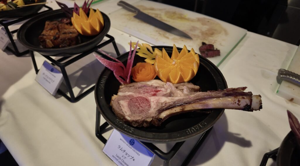 焼きたてのラムチョップやポークスペアリブを、心地よい音楽を聴きながらゆっくりと味わいました。どの食事の時間も慌ただしさがなく、ひとつひとつを丁寧に楽しめる。そんな優雅なひとときを過ごせるのは、やはりラグジュアリー船ならではだと感じました。