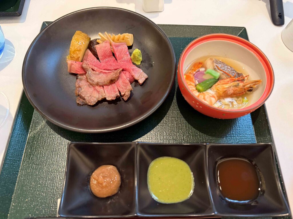 三井オーシャンフジの魅力のひとつが、食のクオリティ。コース仕立てのディナーは、和食と洋食の日替わりで、初日は和食のコース。メインは国産牛のローストと初日から豪勢なお食事でした。