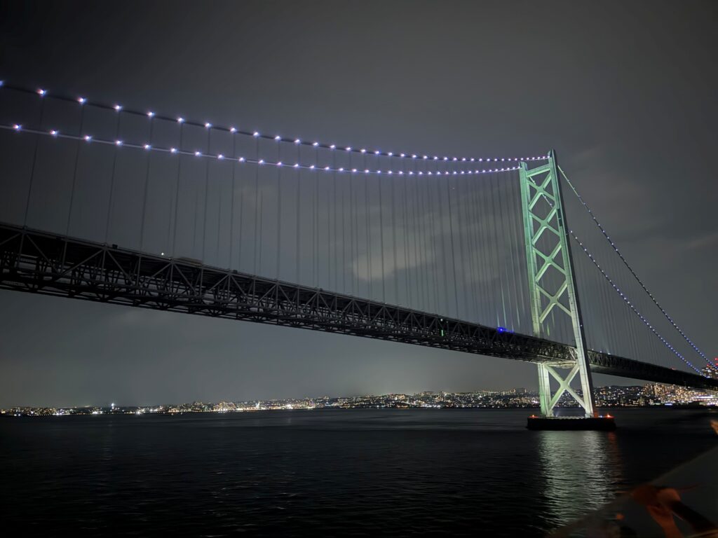 夜風と波の音に包まれながら、海上から見上げる明石海峡大橋のスケールに圧倒されました。