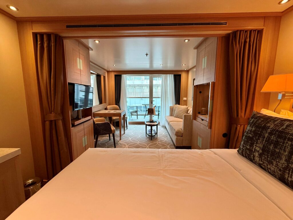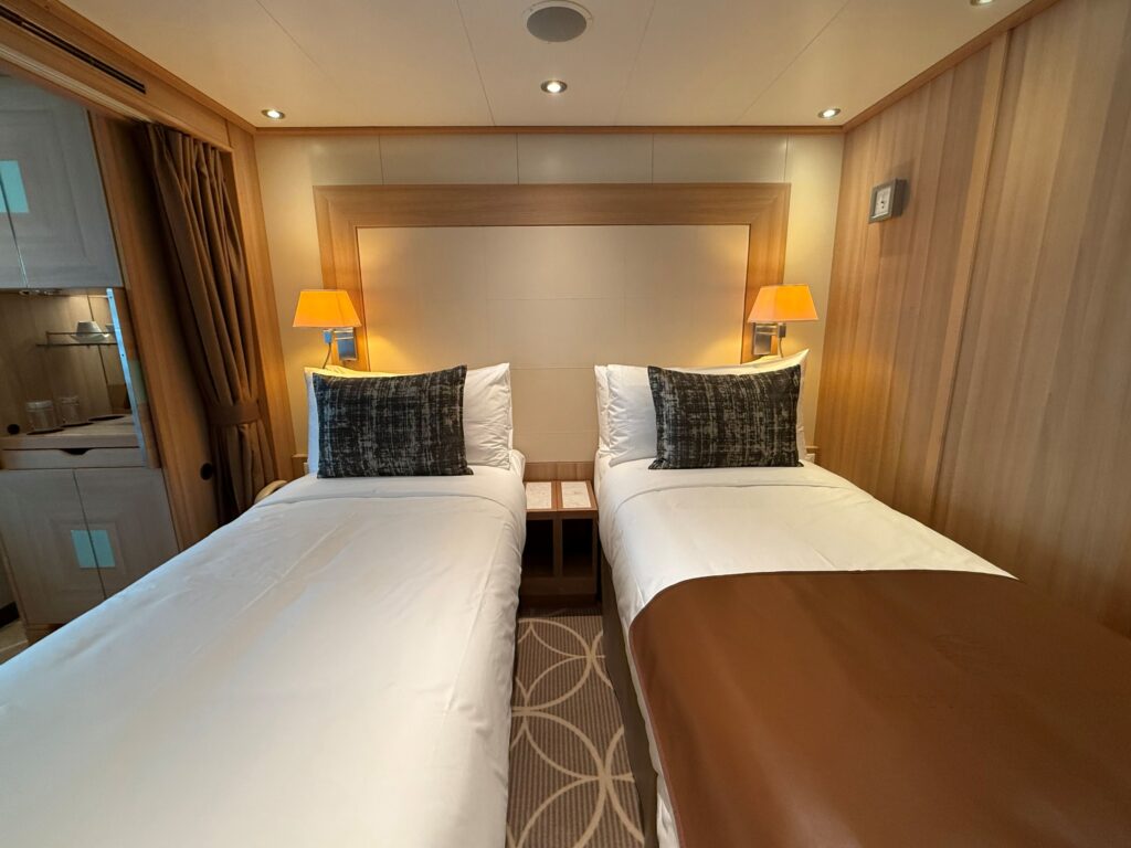 船の中とは思えない約30㎡の客室は、ふかふかのソファがあるリビングエリア、シングルベッドが2台あるベッドエリアと区切られているので、ゆったり過ごすことができました。