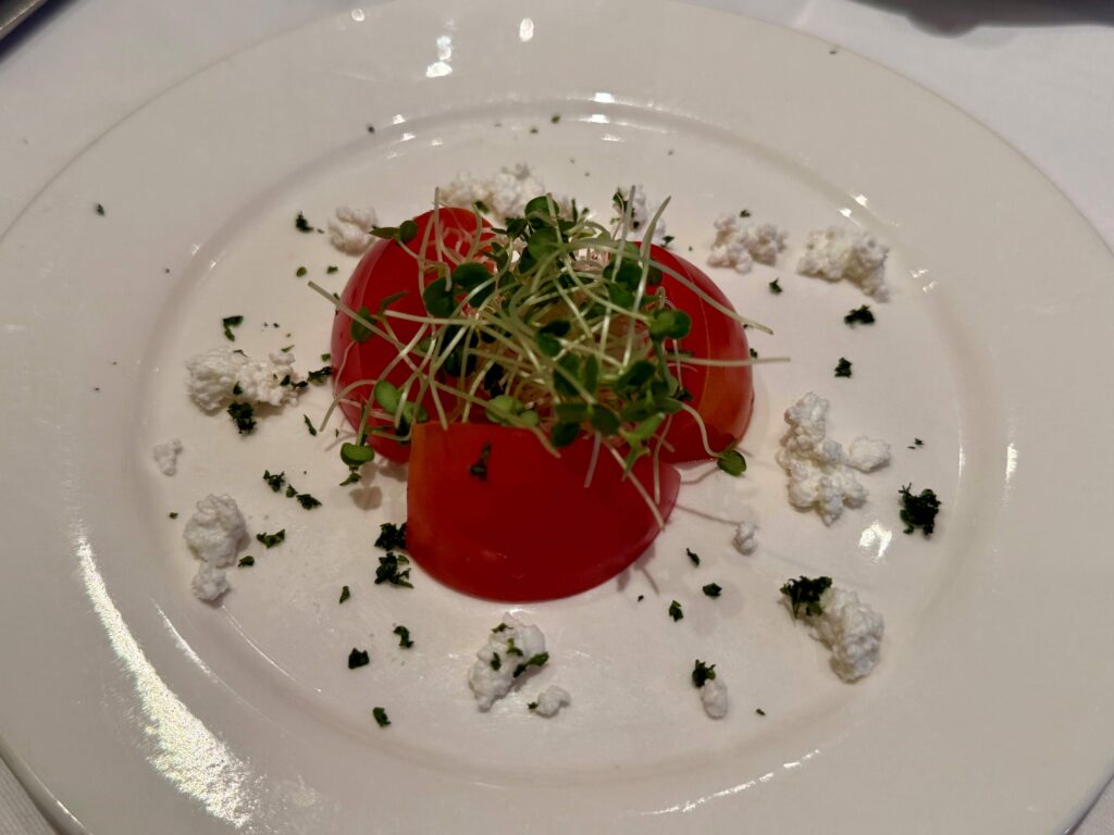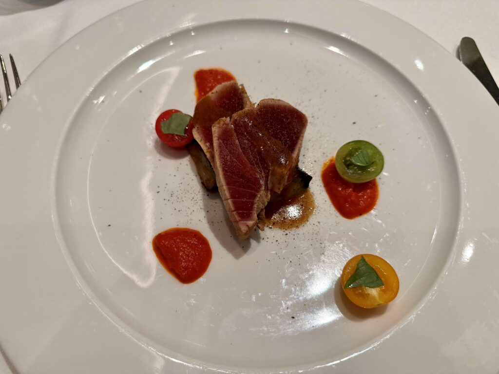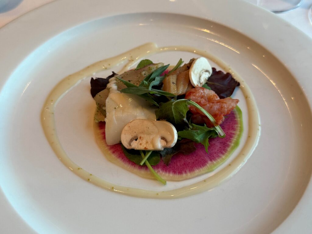三井オーシャンフジといえば、有料レストラン「北斎 FINE DINING」が有名ですが、人気すぎて予約が取れず。残念に思っていたところ、なんとこの日は三國シェフのスペシャリテのカツオのミキュイグリエ、茄子のラタトゥイユが提供されるとのこと。