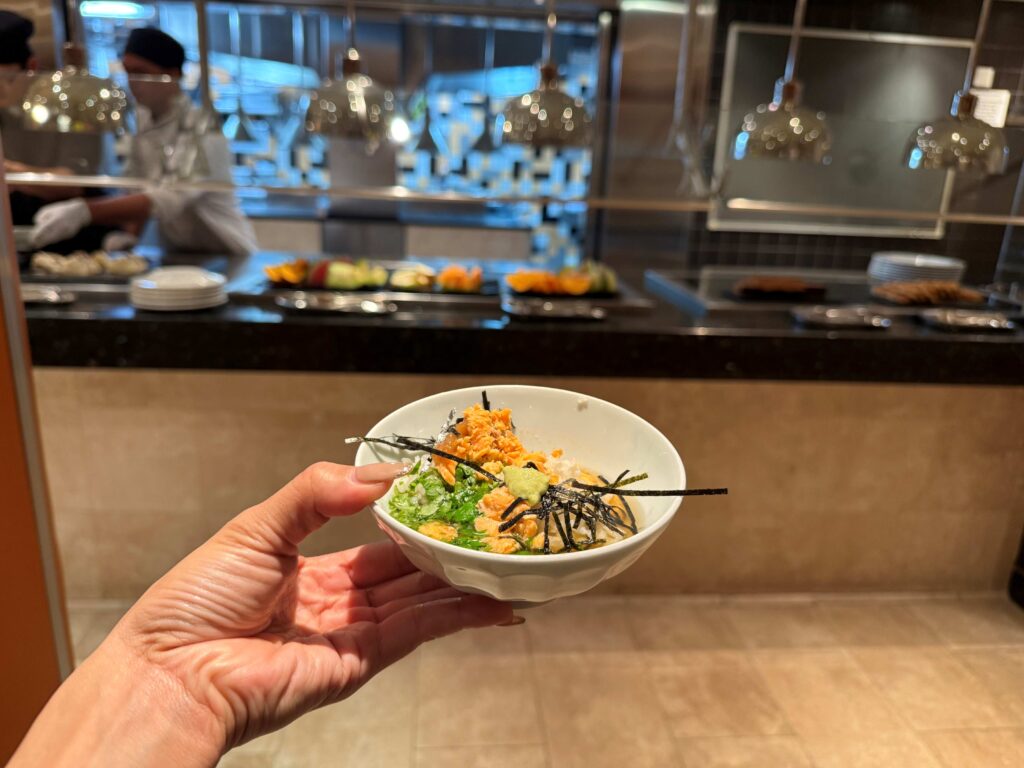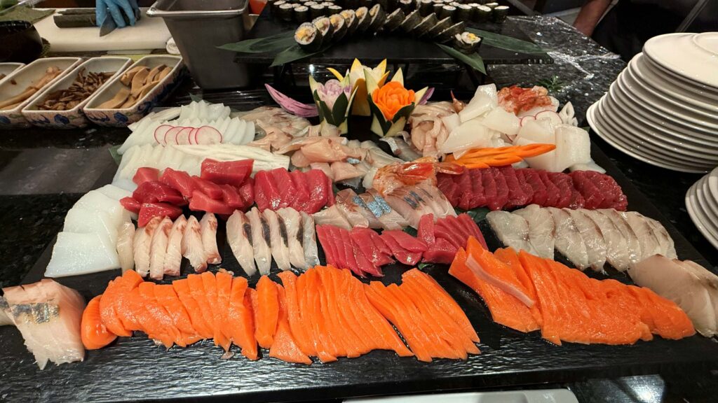 デッキディナー以外だと、ブッフェレストランの「テラスレストラン八葉」が開いていたので、帰りにチラッとメニューを見に行ってみると刺身やお寿司のコーナーも用意されていました。
