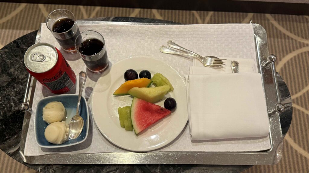 部屋から電話でコーラ、豆乳アイスクリーム、そしてフルーツをオーダーしました。