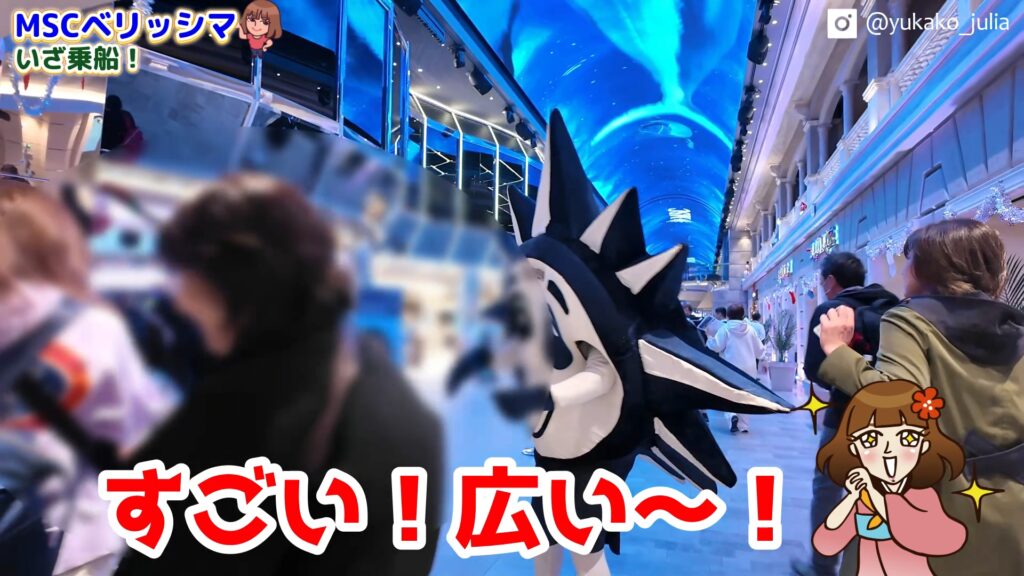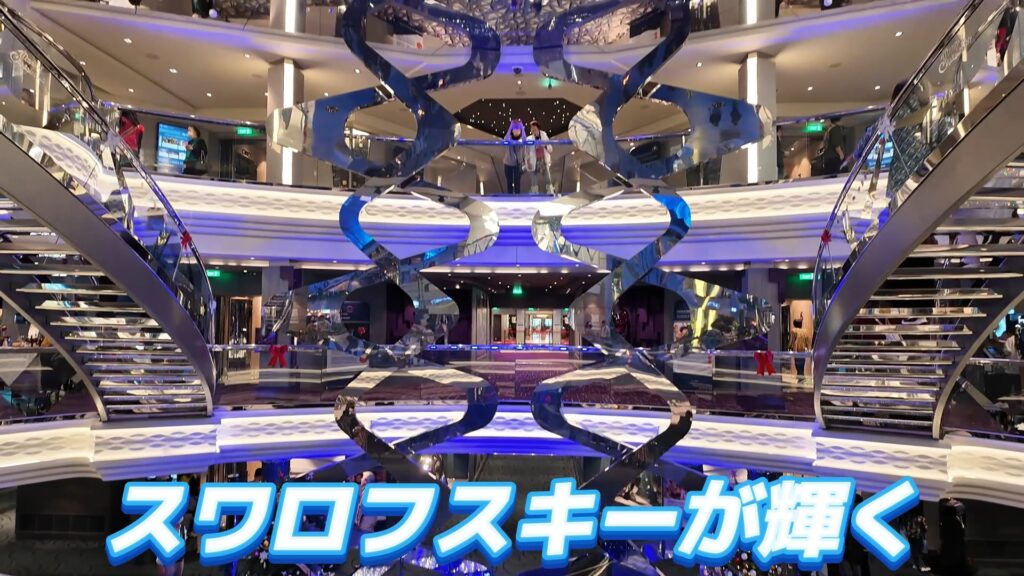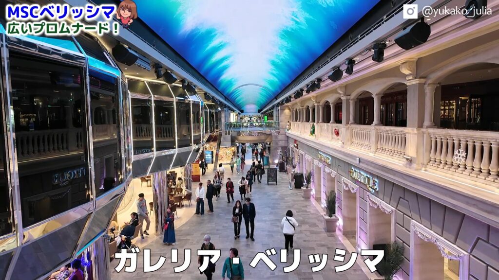 MSCベリッシマのプロムナードは、なんと言ってもその壮大さが特徴的です。船内の中心には、96メートルにも及ぶ巨大なLEDスクリーンが設置されており、時間帯によって映像が変わるので、歩くだけで目を楽しませてくれます。このスクリーンの前に立つと、その圧倒的な存在感に驚くばかり。