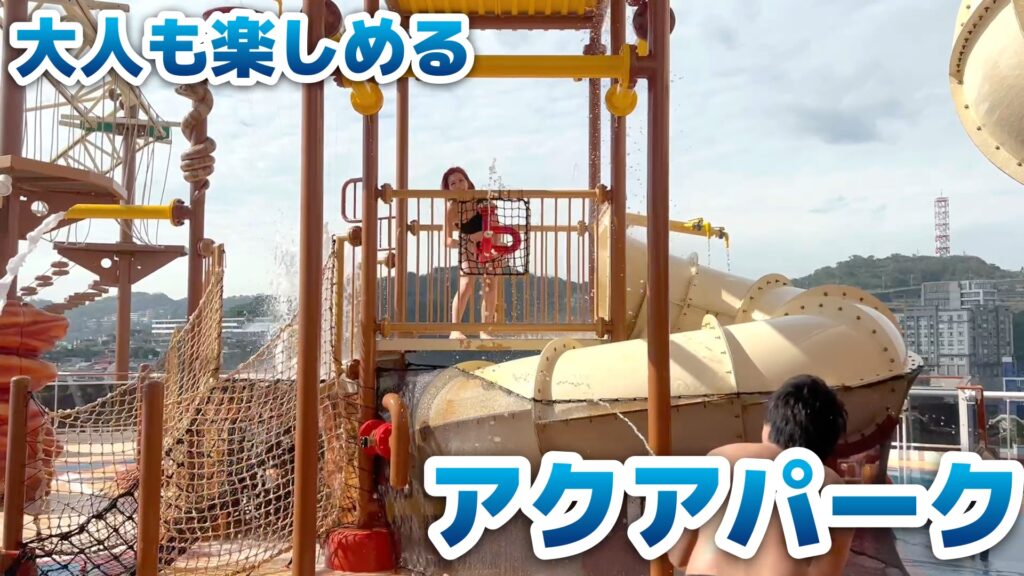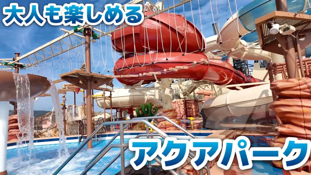 船の屋上には、巨大なウォーターパークが広がっています。子供から大人まで楽しめる無料のウォータースライダーやプールがあります。ウォータースライダーは本格的でスリル満点!水しぶきとともに一気に滑り降りるのは、何度でも挑戦したくなるほどの楽しさです。
