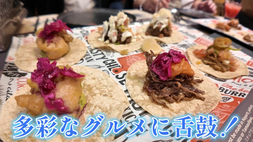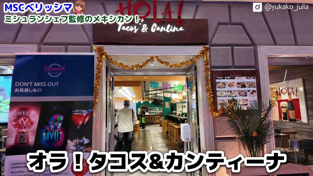 船内には有料のレストランもあり、その中でもメキシカンレストラン「オラ!タコス&カンティーナ」が特におすすめ。新鮮な素材を使ったタコスは、まさに絶品!サルサやグアカモレなどのトッピングも豊富で、ピリッとしたスパイスとフレッシュな味わいが絶妙です。