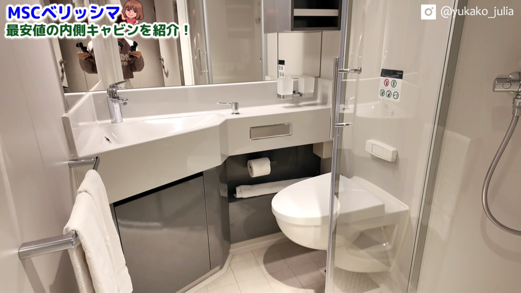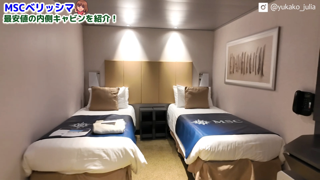 MSCベリッシマで最もリーズナブルな内側客室。外の景色が見られない窓なしタイプの客室ですが、広さは十分で快適に過ごせました。ベッドは基本ツインで、必要に応じて客室係の方にお願いすると、くっつけてもらうことができます。