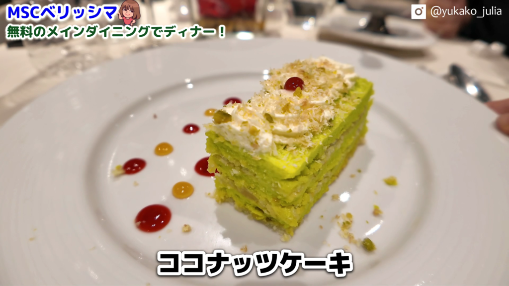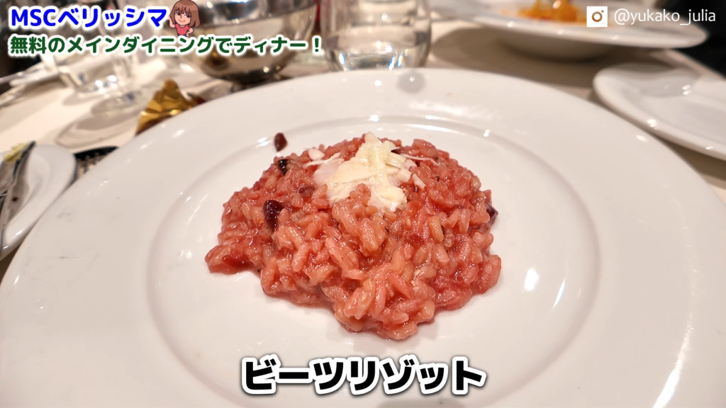 メインダイニングでは、朝・昼・晩の食事が無料で提供され、コースメニューが楽しめます。毎回異なる料理が並び、どれも美味しく、クルーズを楽しむための大切な時間です。