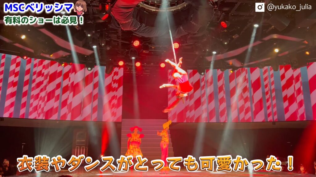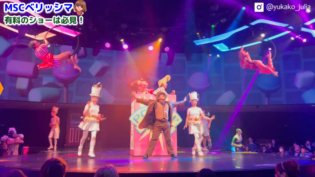 MSCベリッシマでは、有料のショーも充実しており、豪華なパフォーマンスを楽しむことができます。照明や音響、演出が見事で、まるで本場の劇場にいるかのような迫力を感じます。