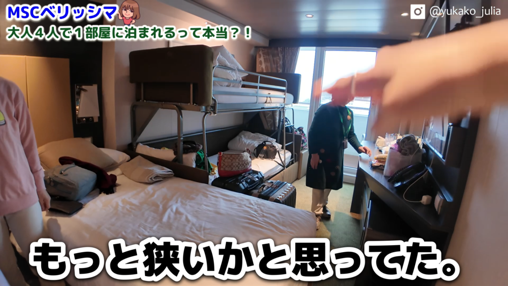 今回は実際に母は大人4人で宿泊し快適に過ごせたとのことですが、長い航路の場合は内側キャビンを2室予約する方がゆったりと過ごせると思いました。母たちは毎日ローテーションで寝るベッドを交換したそうです。笑