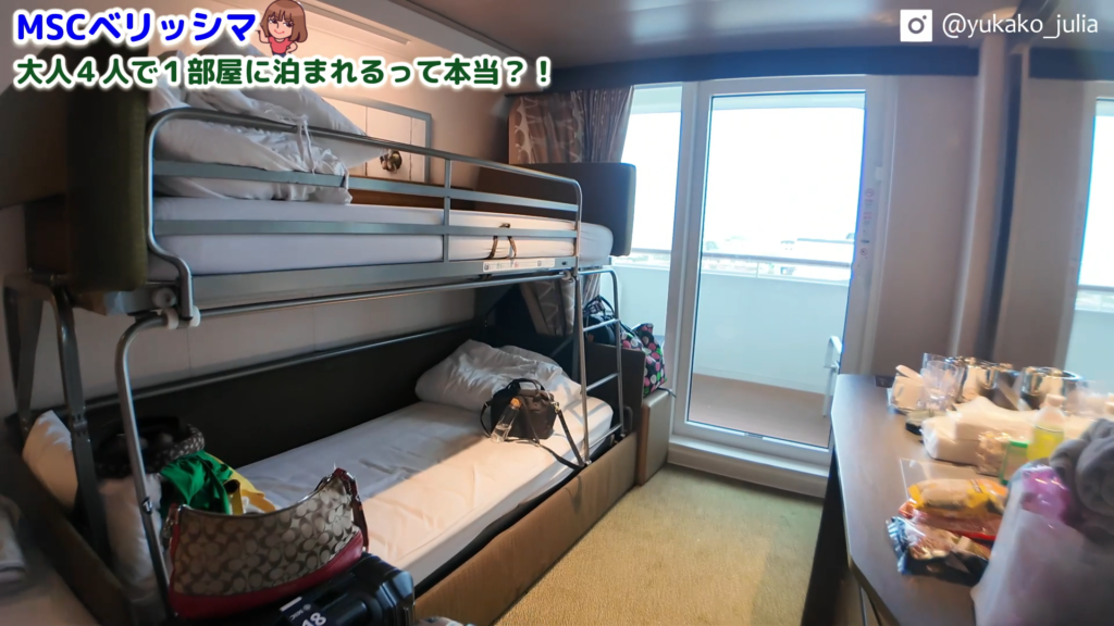 バルコニー客室に大人4人で宿泊することもできます。その際は、既存のベッド2つに加え、2段ベッドが追加されます。その分、ソファはありません。バルコニーからの眺めが楽しめますが、2段ベッドを配置すると少し手狭に感じることがあります。