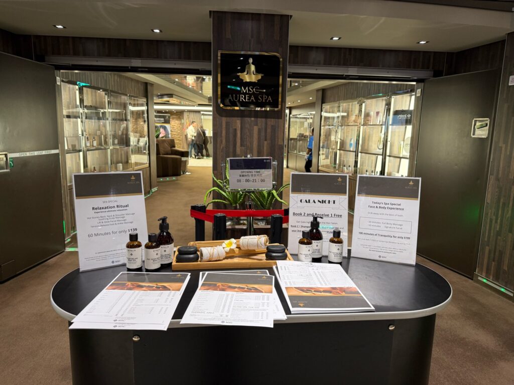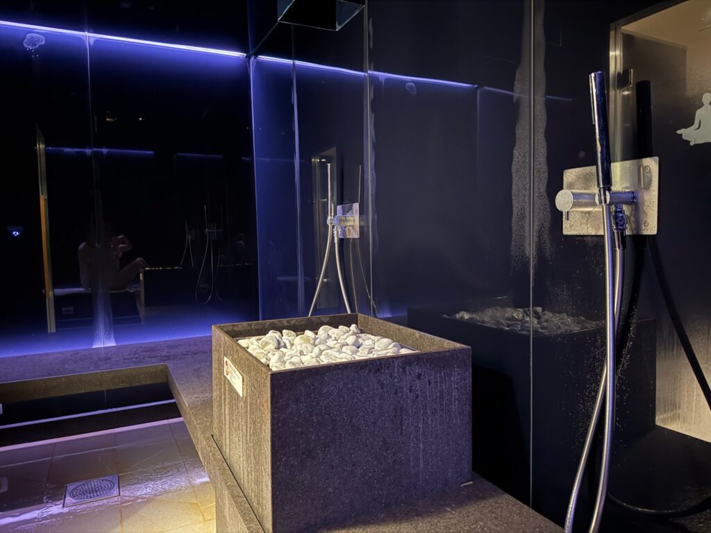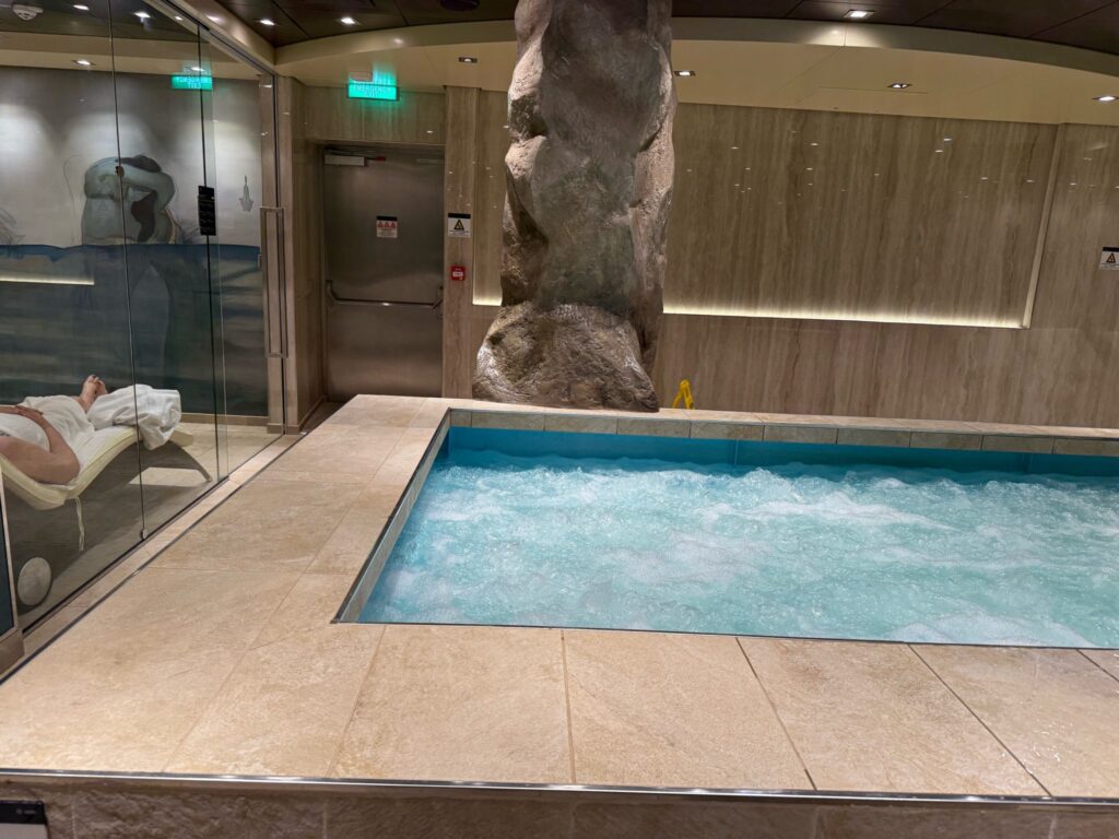 MSCべリッシマ船内にある贅沢なスパ施設。こちらは通常有料なのですが、サウナゾーンへのアクセスが無料で特典についていました。サーマルエリアは大人だけが入れる空間なので、落ち着いた癒し時間を過ごせます。混んでいなければ、そのまま入れることもありましたが、基本的に電話か入口の受付で予約が必要です。