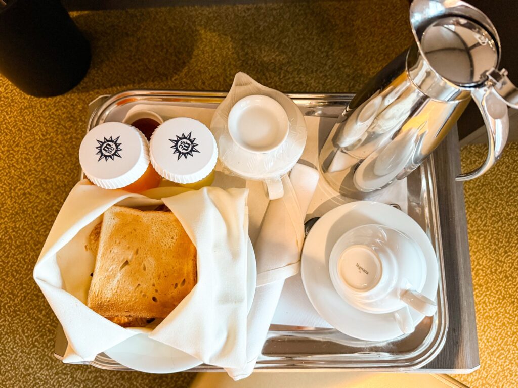 前日の夜、専用のモーニングオーダー用紙に希望のメニューと時間を記入し、部屋の外のドアノブに掛けておくだけで、翌朝、指定した時間に朝食が部屋まで届けられます。私たちは、パンやシリアルなどの軽めのメニューを少しだけオーダーして、ゆったりと朝のひとときを楽しみました。コーヒーやミルク、オレンジジュースといったドリンク類も選べます。