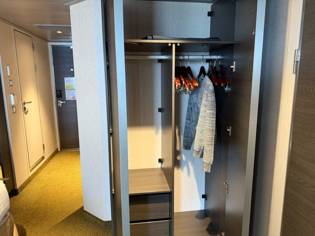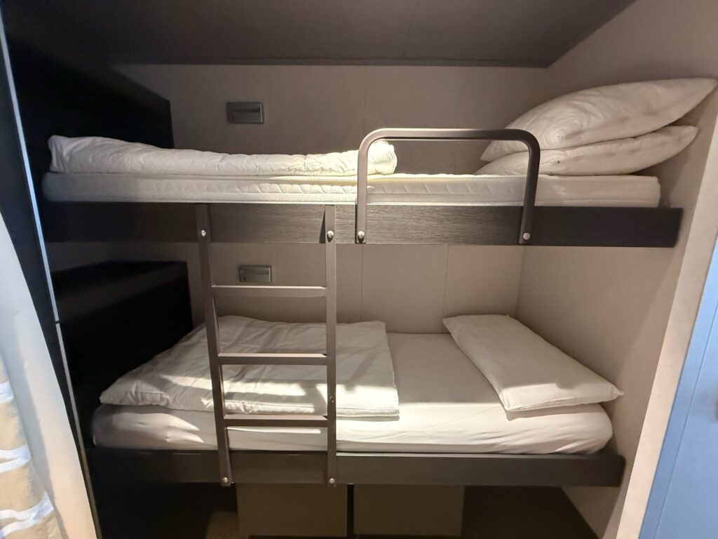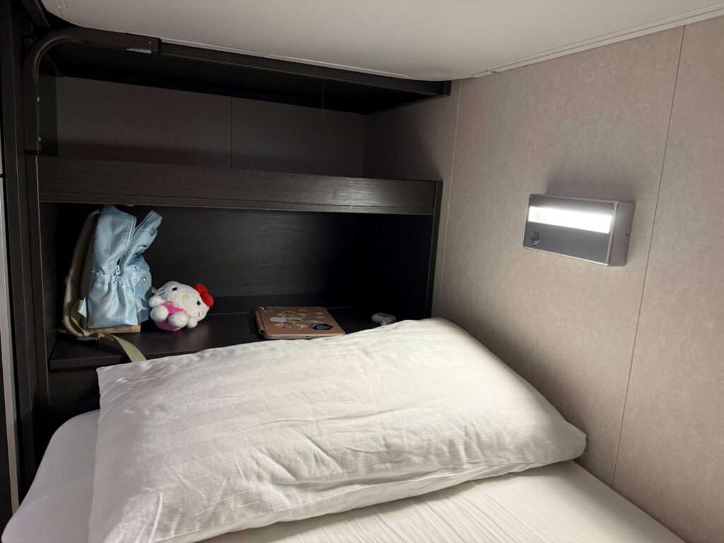 また2段ベッドの周囲にはカーテンも付いていて、ちょっとした秘密基地のような雰囲気。子どもにとってはこの“隠れ家感”もたまらないようです。また、夜に夫がカジノやバーから戻ってきた際は、私たちを起こさないように下段ベッドでそのまま就寝することも。身長180cmの夫にはややコンパクトだったようですが、それでもしっかり熟睡できたとのことでした。