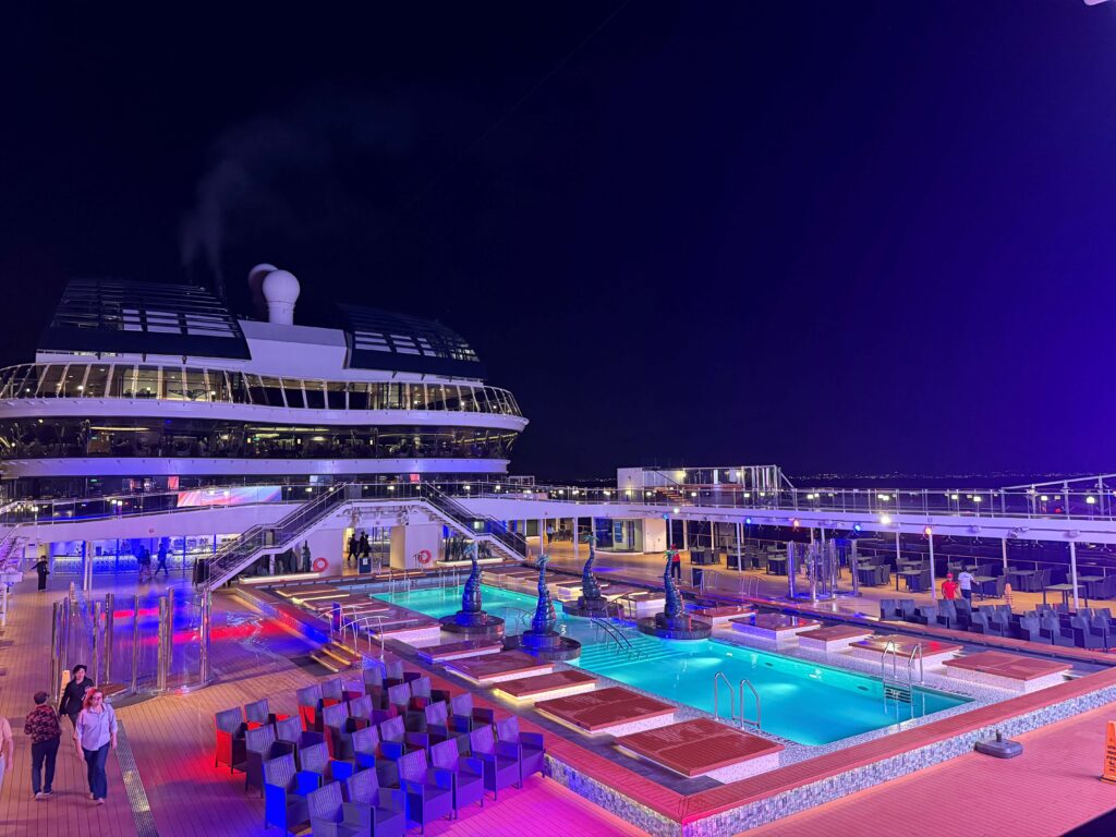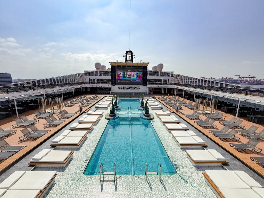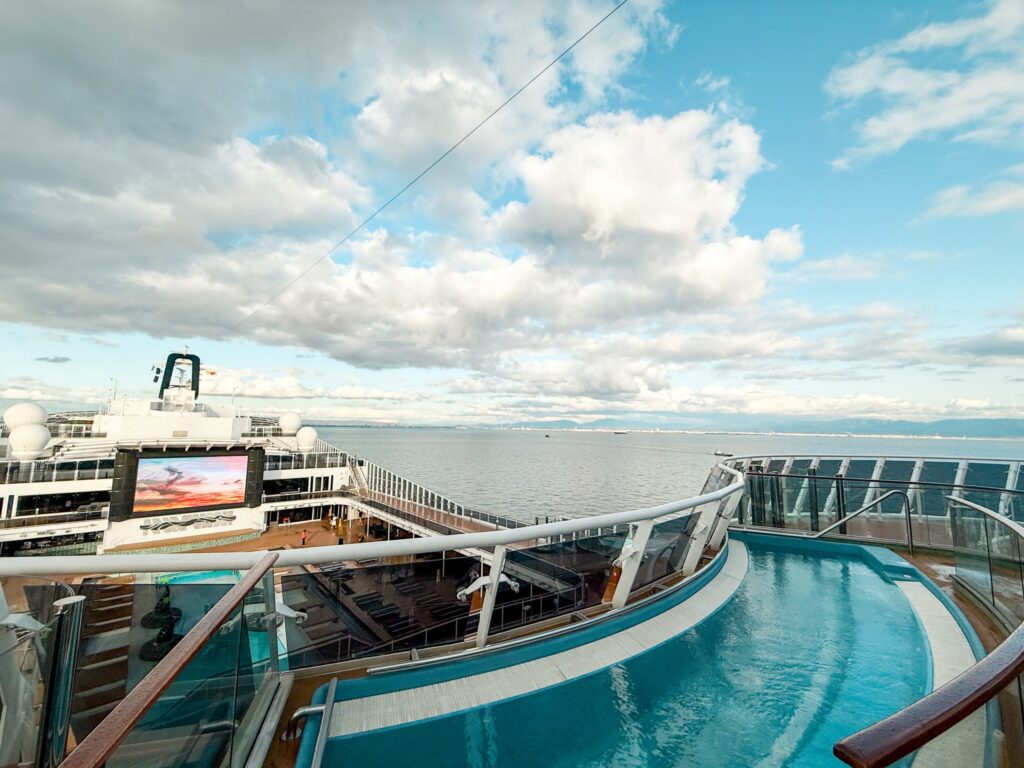 船を見渡せる眺めの良い場所にあるプールに入れるのも、アウレア特典の一つ。入り口で、クルーズカードをかざすと入れます。その場でバスタオルを借りることもできました。人も少なめで、時間帯によっては貸切状態で過ごせて心地よかったです。お天気の良い日は、日光浴を楽しむ方の姿も見かけました。