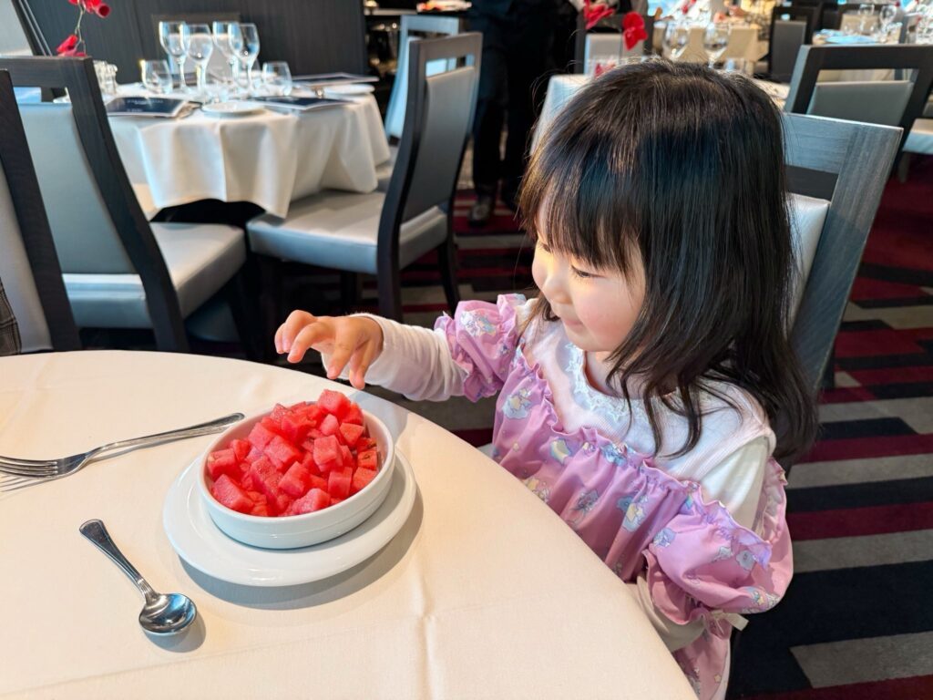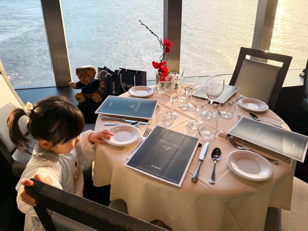 こちらは子連れには本当に助かるポイント。3歳の娘は日によってお昼寝をしたりしなかったり。その日その日の体調や生活リズムで、夜眠くなる時間やお腹が空くタイミングが変わってしまいます。夕食時間を当日、自由に決められるのは大きなメリットでした。さらに、ショーやイベントの時間との調整も柔軟にできるので、子供を優先しながら、大人もしっかりコースディナーを楽しめました。