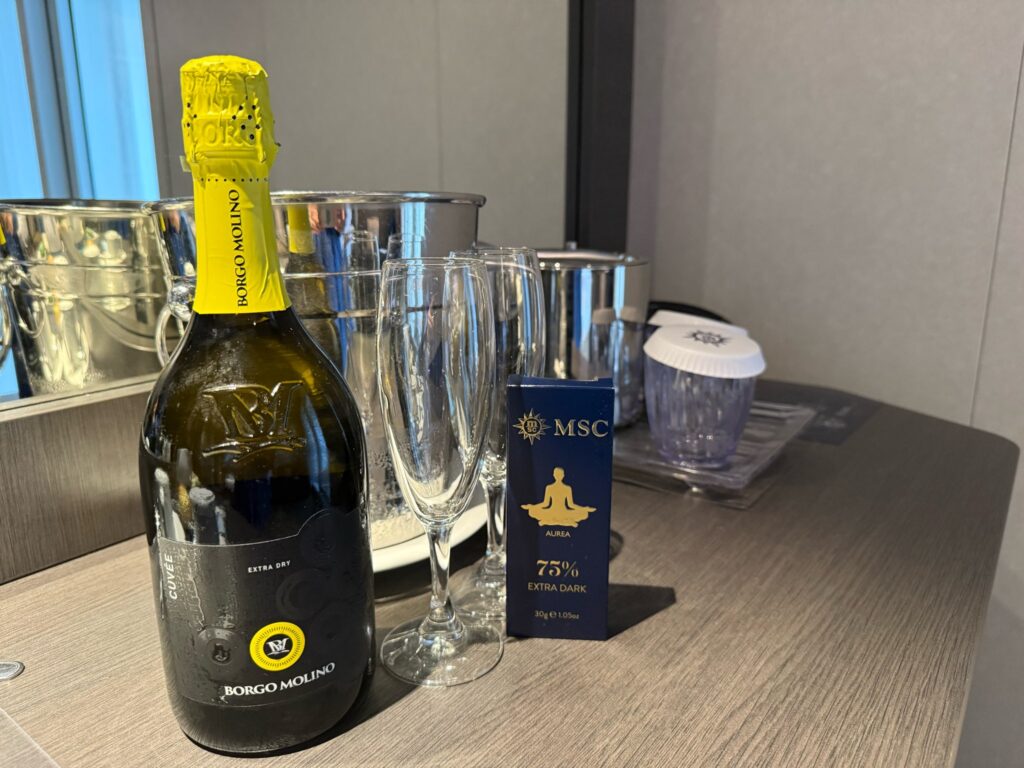 客室に入ると、今回はシャンパンとチョコレートのサービスがありました。旅の始まりのテンションを上げてくれるプレゼント、美味しくいただきました。