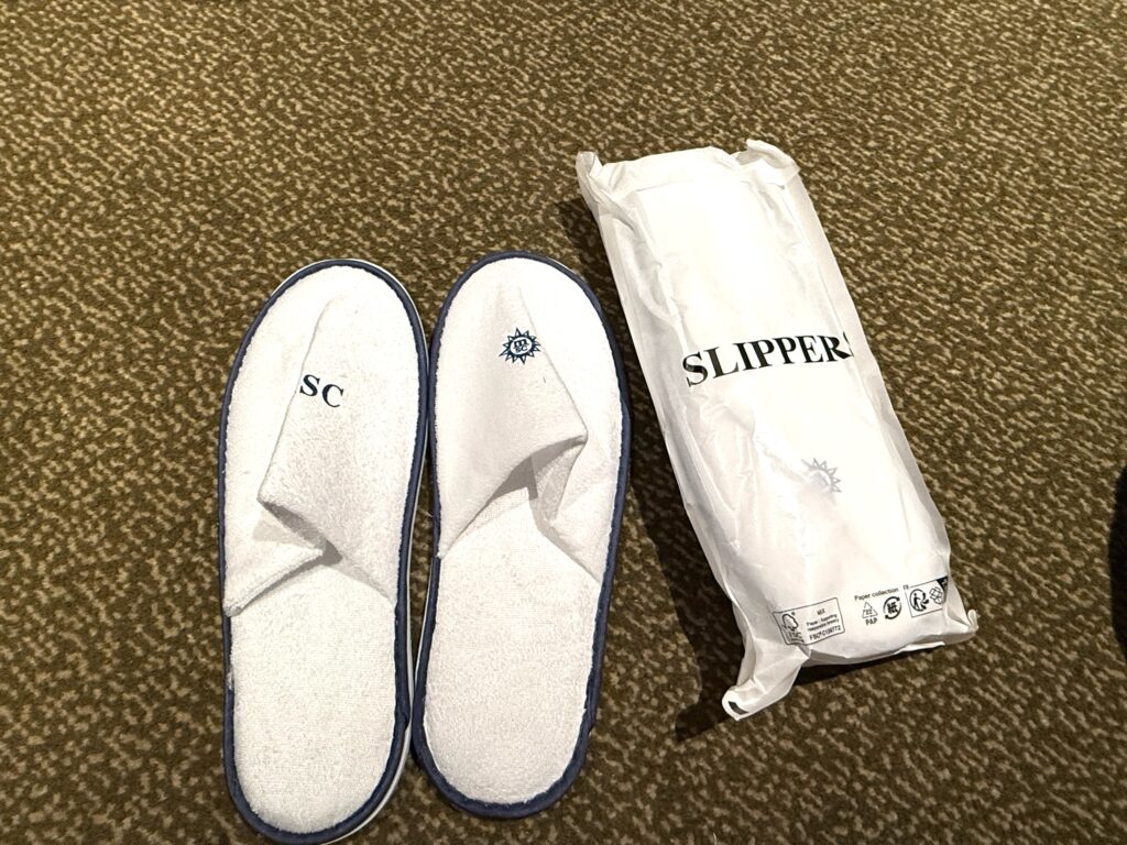 バスローブやスリッパのアメニティも便利。スリッパは最初なかったので、クルーさんに尋ねたら持ってきていただけました。バスローブは、交換もしていただけました。