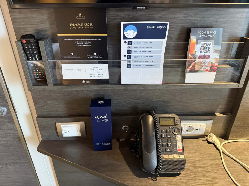 今回は利用しませんでしたが、24時間対応ルームサービス(デリバリー料金無料)、希望の枕を選べたり、船内スパ・トリートメント料金10%割引などの特典もあったようです。