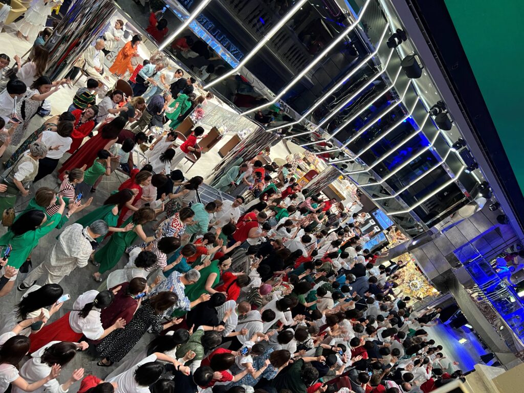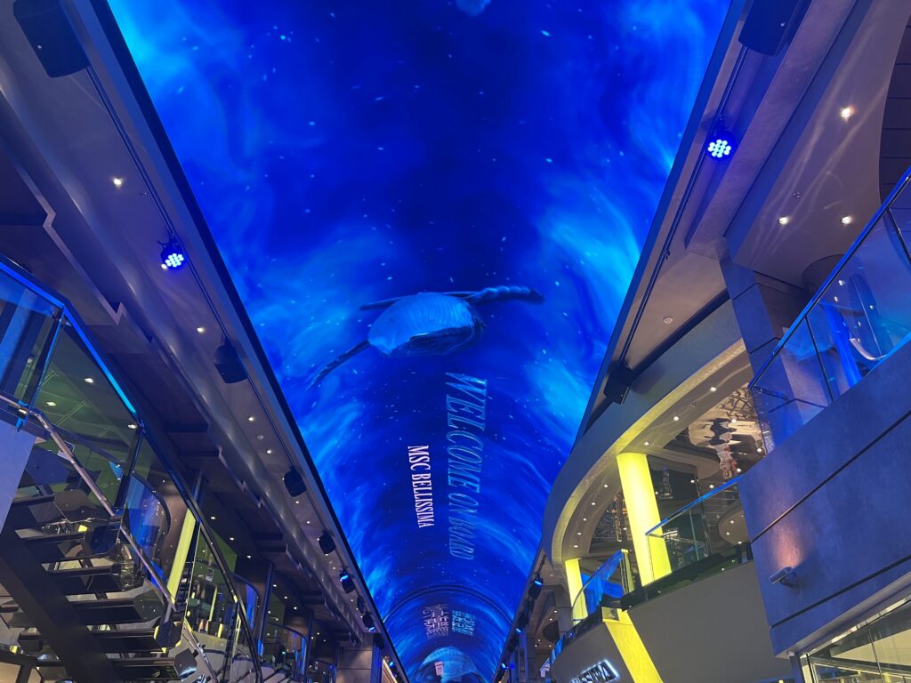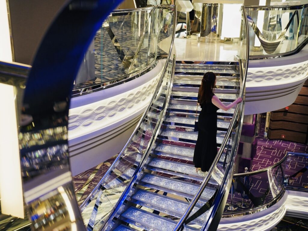 乗船してまず圧倒されたのは3層吹き抜けのプロムナードです。1段に640個ものスワロフスキーが敷き詰められた階段に目を奪われたかと思えば…さらに続く長さ96メートルの壮大なLEDドーム。