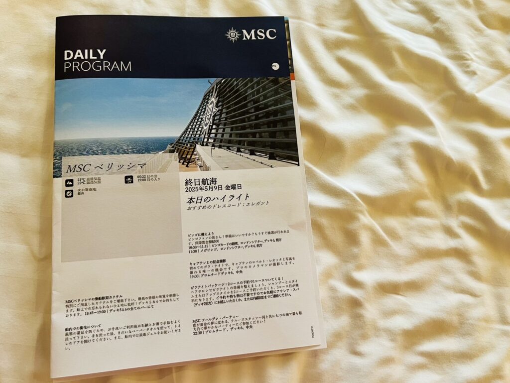 お部屋には毎晩船内新聞が届くので、翌日のイベントをチェックして予定をたてるのも楽しみです。最近では、イベント情報の確認、レストランやショーの予約などができる専用アプリを提供する船が増えており、MSCベリッシマにもアプリがあります。しかし、やはり紙ベースの情報は見やすくて嬉しいですね。