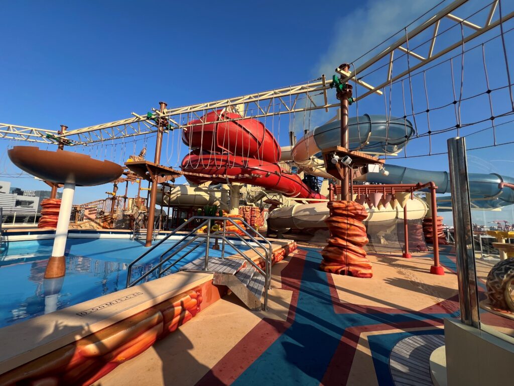 プールは屋外・屋内にあり、最上階にはウォーターパークがあって3種類のスライダーもあります。