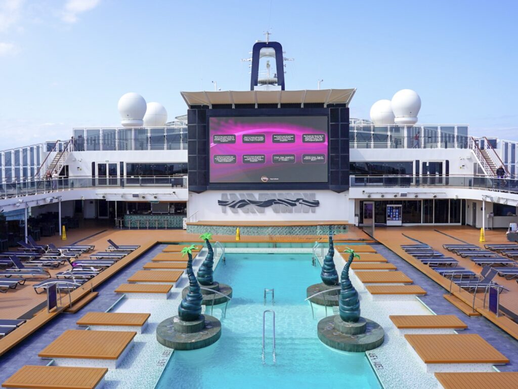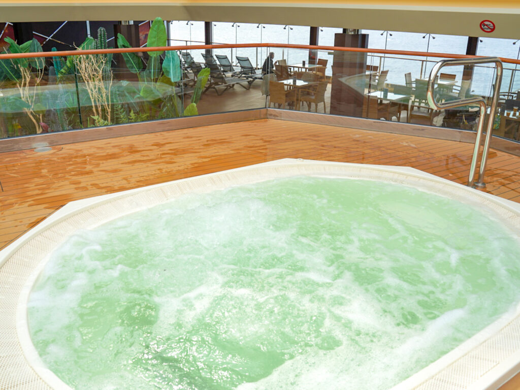 851のデッキチェアと大型スクリーンを備えた大型の屋外プール。こちらではプール以外も出航時のパーティやホワイトパーティなど開催される場所。乗船した5月はプールを入るには少し寒そうでしたが、右舷側、左舷側ともに温水のジャグジーもあったのでジャグジーを楽しむ方が多くいらっしゃいました。またプールベットで日光浴したり、読書したり思い思いの時間を過ごすのにぴったりの場所でしょう。