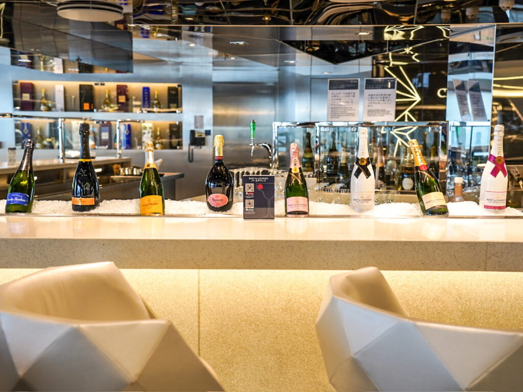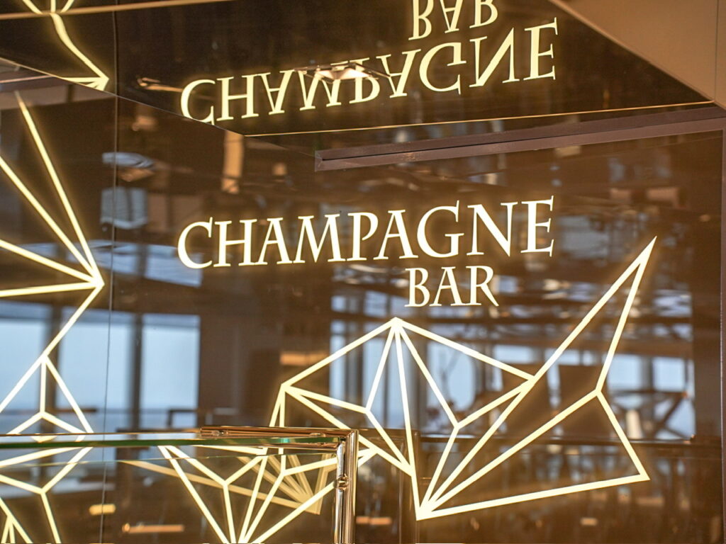 スタイリッシュなシャンパンバーではキャビア、オイスター、そして世界各地のシャンパンを楽しむことができます。