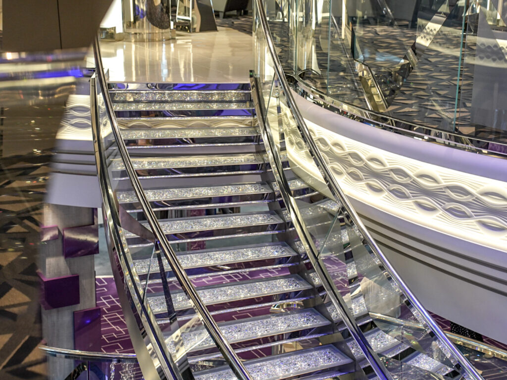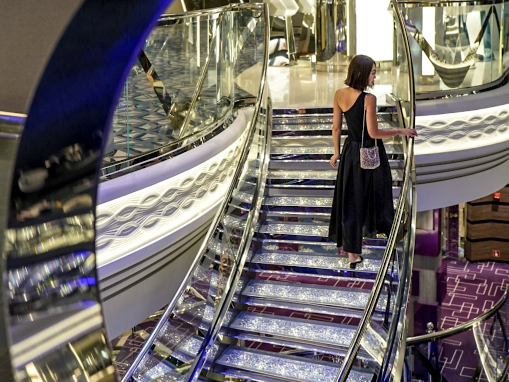 豪華6万個のスワロフスキークリスタルを使用したゴージャスな階段は、カジュアル船ながら、おしゃれでゴージャスなインテリアがラグジュアリー感を演出してくれます。