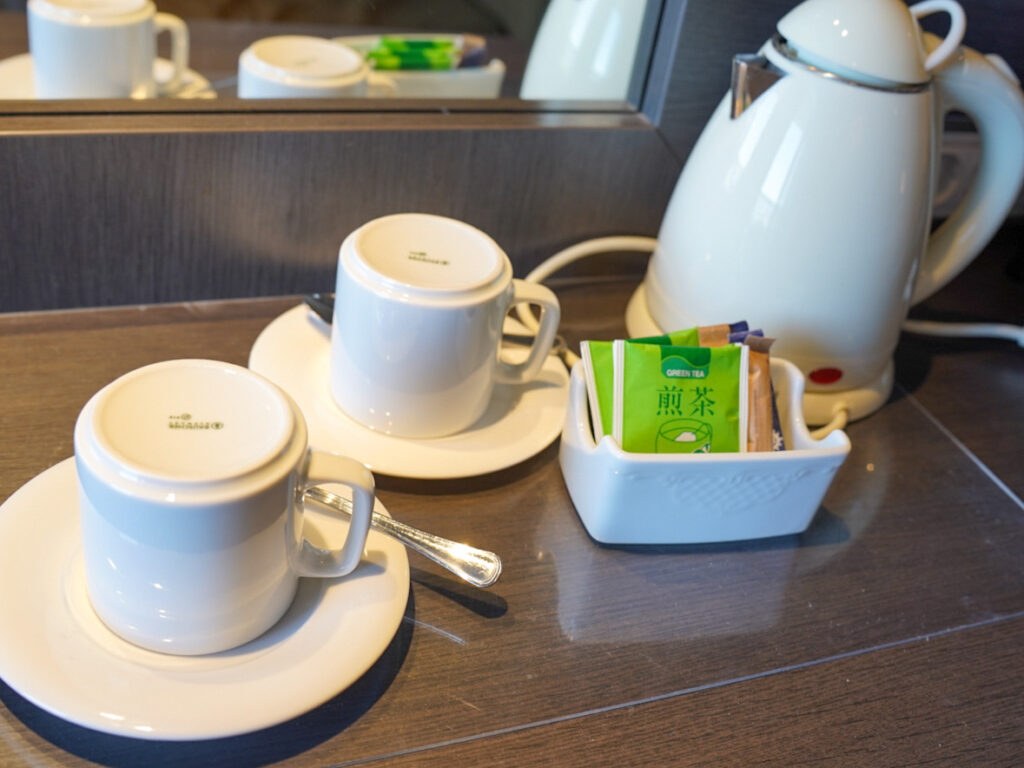 デクスには日用品がすっきり収納できるチェストに冷蔵庫、電気ケトル、フリードリンクの日本茶や紅茶のティーパック、Bluetoothのスピーカーなど備え付けてありました。