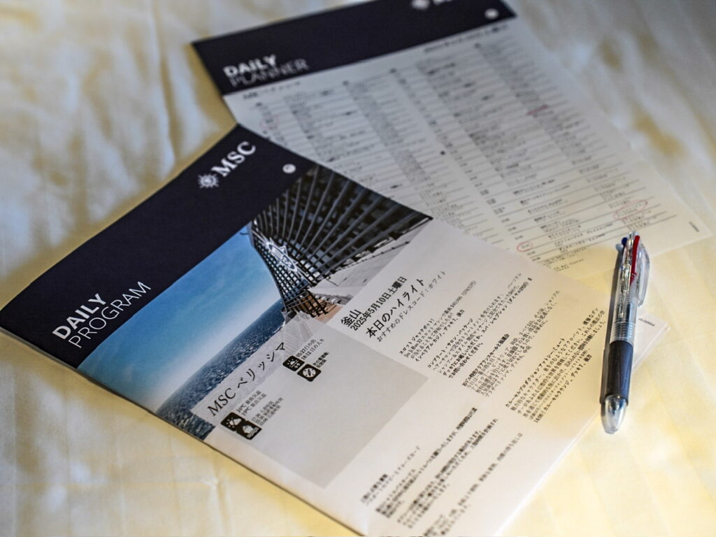 MSCの船内新聞の他にも、ベルーナクルーズ新聞がお部屋に配布され重要事項などがまとめてありました。