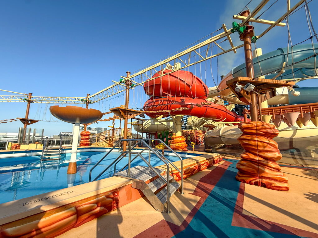 なんと船上の豪華なウォーターパークがあります。大迫力なウォーターパークには、3台のツイストスライド、ヒマラヤンブリッジ、各種プールがあります。プール部分の水深は50cm。