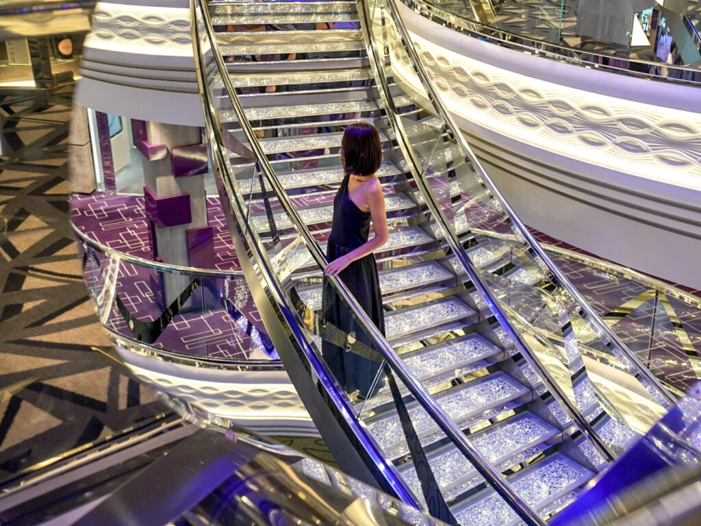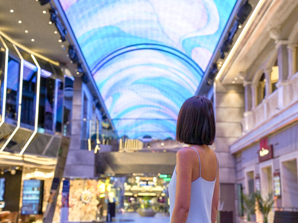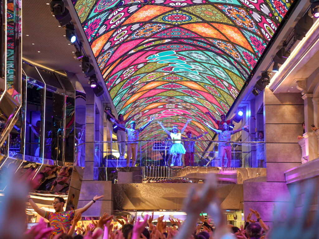 大型のクルーズ船には、多い時で3,000人以上のゲストが乗船するので、船の中はどこも賑やかな場所が多いです。